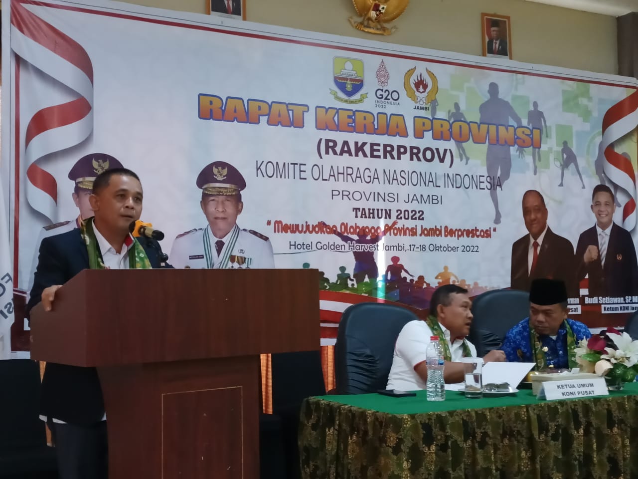 RuangJambi – Komite Olahraga Nasional Indonesia (Koni) Provinsi Jambi menggelar Rapat Kerja Provinsi (Rakerprov) Jambi Tahun 2022, dengan tema “Mewujudkan Olahraga Provinsi Jambi Berprestasi”, Rakerprov ini secara resmi dibuka langsung oleh Gubernur Jambi Al Haris. Bertempat di Golden Harvest, Senin (17/10/2022).