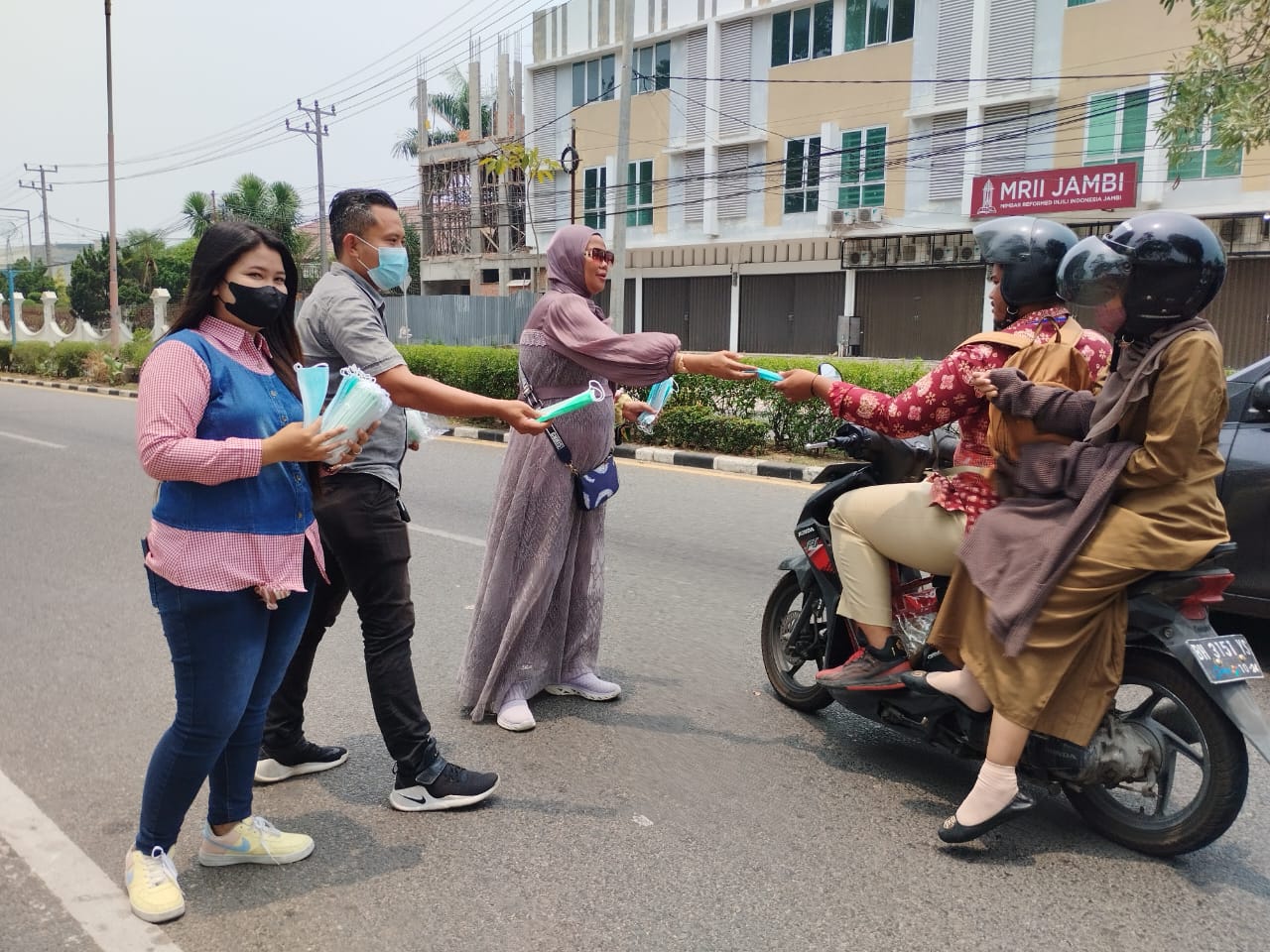 Sekitar pukul 11.00 Wib, Ketua PW IWO Jambi, Erwin Majam beserta Sekretaris Wilayah, Sanca, Wakil Ketua, Rakhmad Fadilla dan Bendahara, Dhea Viryza membagikan masker pada penguna jalan.