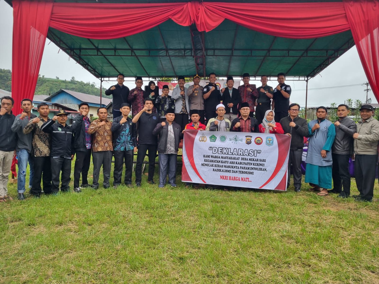 RuangJambi – Densus 88 Satgaswil Jambi dan Polda Jambi serta Polres Kerinci bersama FKUB, MUI, Tokoh Masyarakat dan Tokoh Agama Kabupaten Kerinci telah melaksanakan kegiatan Sosialisasi dalam rangka upaya Pencegahan Radikalisme, intoleran dan terorisme, bertempat di Desa Mekar Sari Kecamatan Kayu Aro, Kabupaten Kerinci.