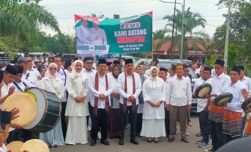 Saat mendaftar ke KPU Kabupaten Muaro Jambi pasangan yang diusung dan didukung partai PKB, PKS, perindo serta PSI diiringi oleh ratusan masa pendukung.