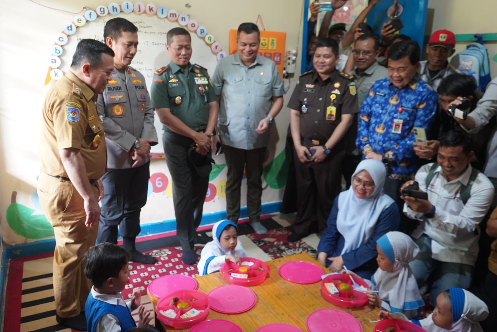 Dalam kesempatan tersebut, Gubernur Al Haris beserta rombongan meninjau langsung proses distribusi makanan serta berinteraksi dengan anak-anak yang menikmati hidangan sehat. Menu yang disajikan pada hari pertama terdiri dari ayam, sayur tumis kacang dan tempe, buah jeruk, serta susu.