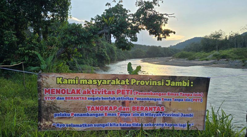 Merangin – Masyarakat Provinsi Jambi menyuarakan penolakan terhadap aktivitas Pertambangan Emas Tanpa Izin (PETI) dengan memasang spanduk imbauan di sejumlah titik pinggir sungai di wilayah Kabupaten Merangin.